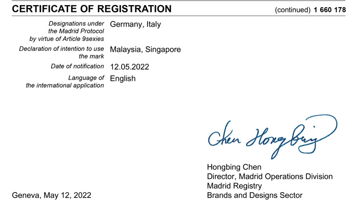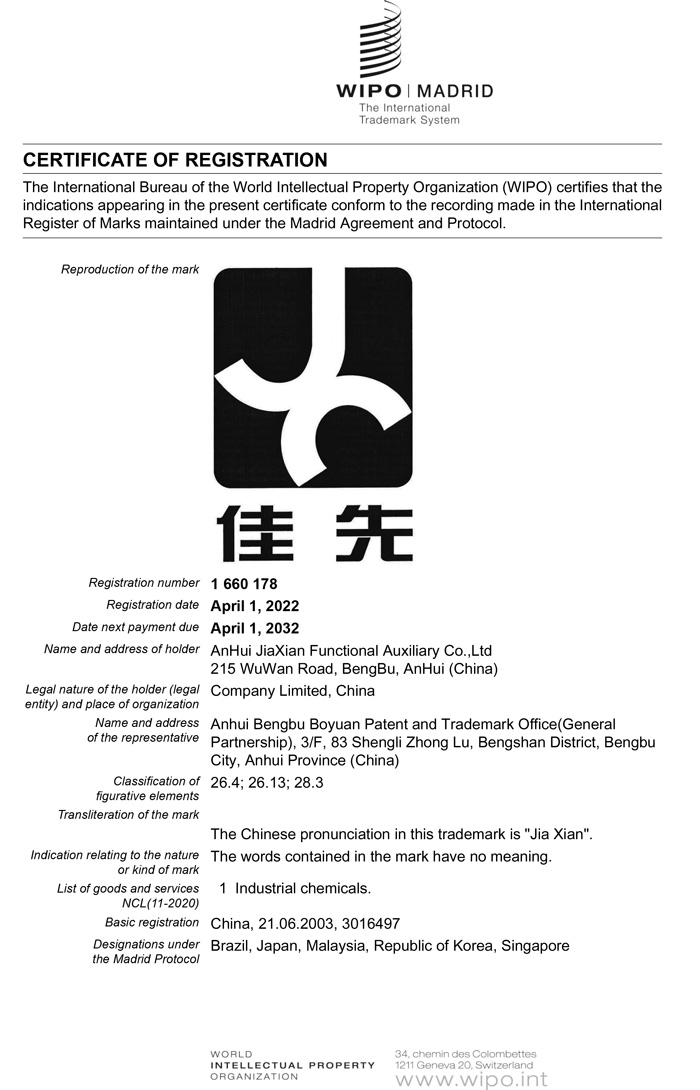 | 公司“佳先”品牌獲馬德里國(guó)際商標(biāo)注冊(cè) |