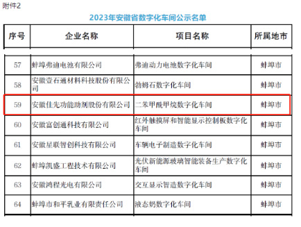 2023年8月8日,安徽省經(jīng)濟(jì)和信息化廳公布了《2023年安徽省智能工廠和數(shù)字化車間名單》。經(jīng)各級(jí)主管部門審核、專家評(píng)審,安徽佳先功能助劑股份有限公司(以下簡(jiǎn)稱“公司”)的二苯甲酰甲烷數(shù)字化車間順利入選2023年安徽省數(shù)字化車間名單。