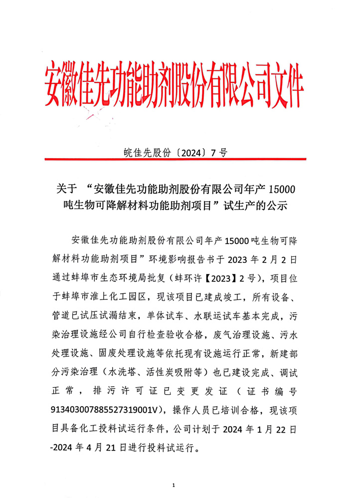 | 年產(chǎn)15000噸生物可降解材料功能助劑項(xiàng)目試生產(chǎn)公示 |